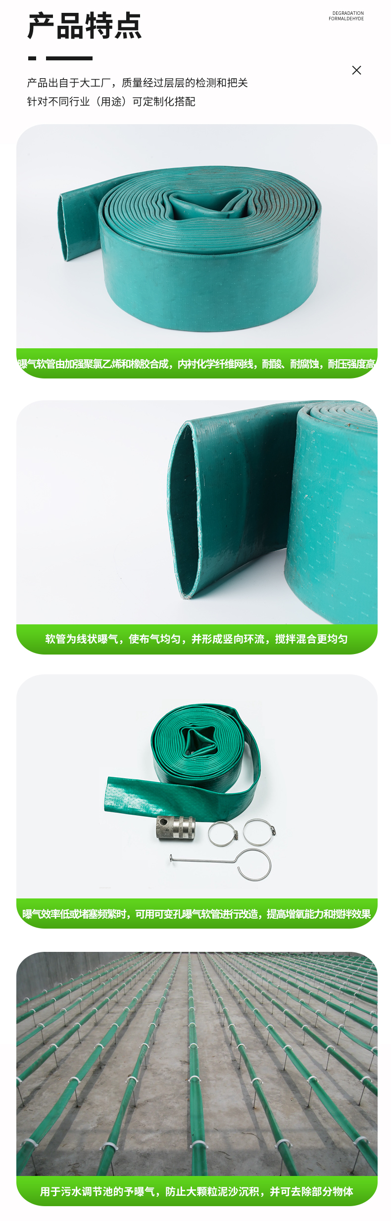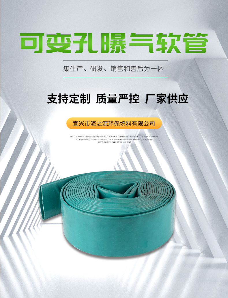 曝氣軟管是引進西德技術開發(fā)成功的新型增氧曝氣器。薄壁、直通道極大降低了曝氣阻力損失;可變孔及狹縫自動開閉,徹底解決了曝氣器的堵塞問題;軟管為線狀曝氣,使布氣均勻,并形成豎向環(huán)流,攪拌混合更均勻;氣泡小,氧利用率和動力效率高。