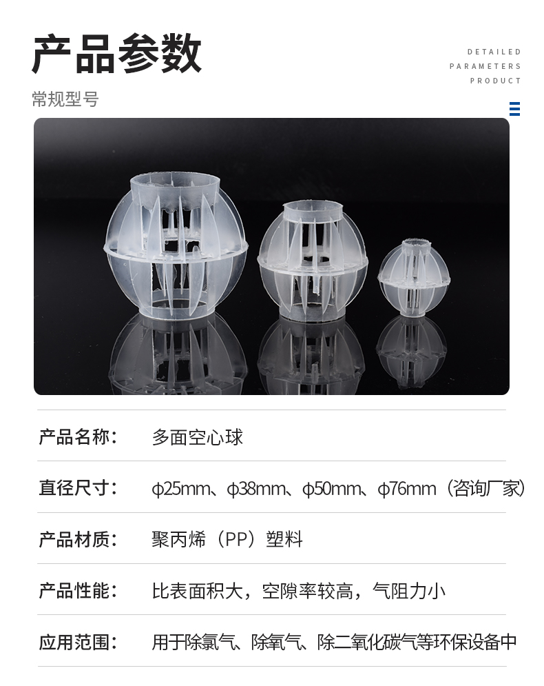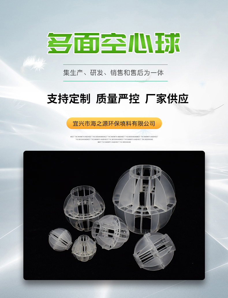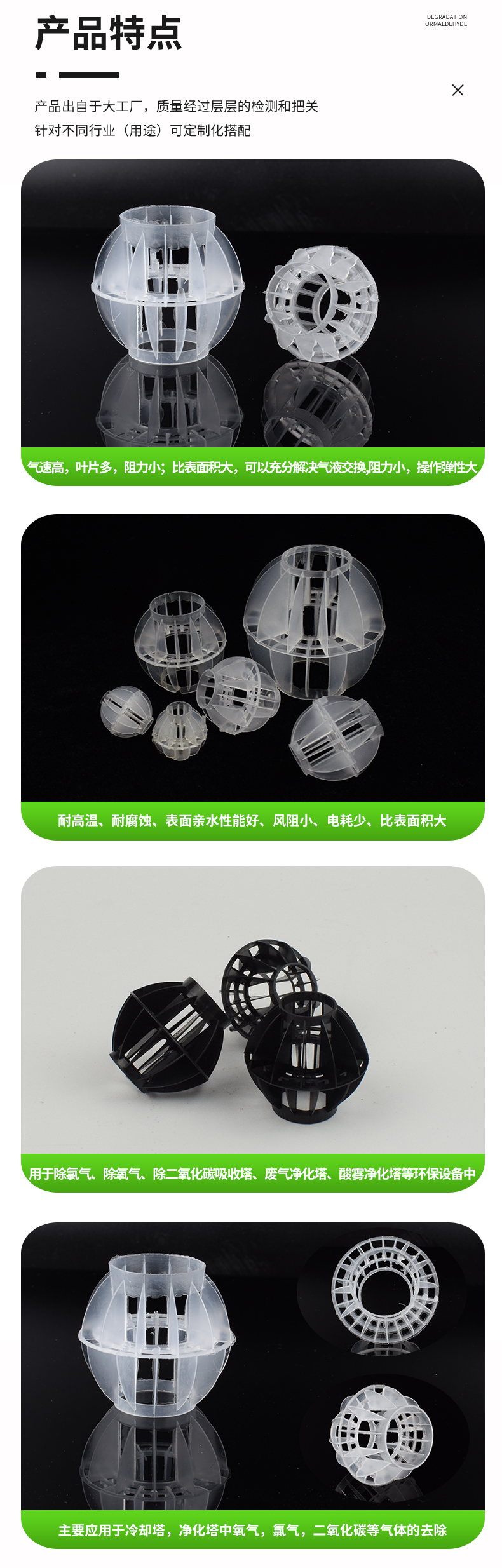 采用聚丙烯(PP)塑料制成球狀,由兩個(gè)半球合成一個(gè)球形,每個(gè)半球上根據(jù)設(shè)計(jì)需要有8-12個(gè)半扇形葉片,兩個(gè)半球的扇形葉片相互錯(cuò)開。該填料特點(diǎn)是比表面積大,空隙率較高。但是由于葉片數(shù)偏多,彼此間有遮蔽效應(yīng),不利于液體分布和潤(rùn)濕;液體大多在球體空心柱聚集,阻礙氣體暢通,因此阻力較大。外觀成球形,主要規(guī)格有φ25mm、φ38mm、φ50mm、φ76mm、φ100mm。