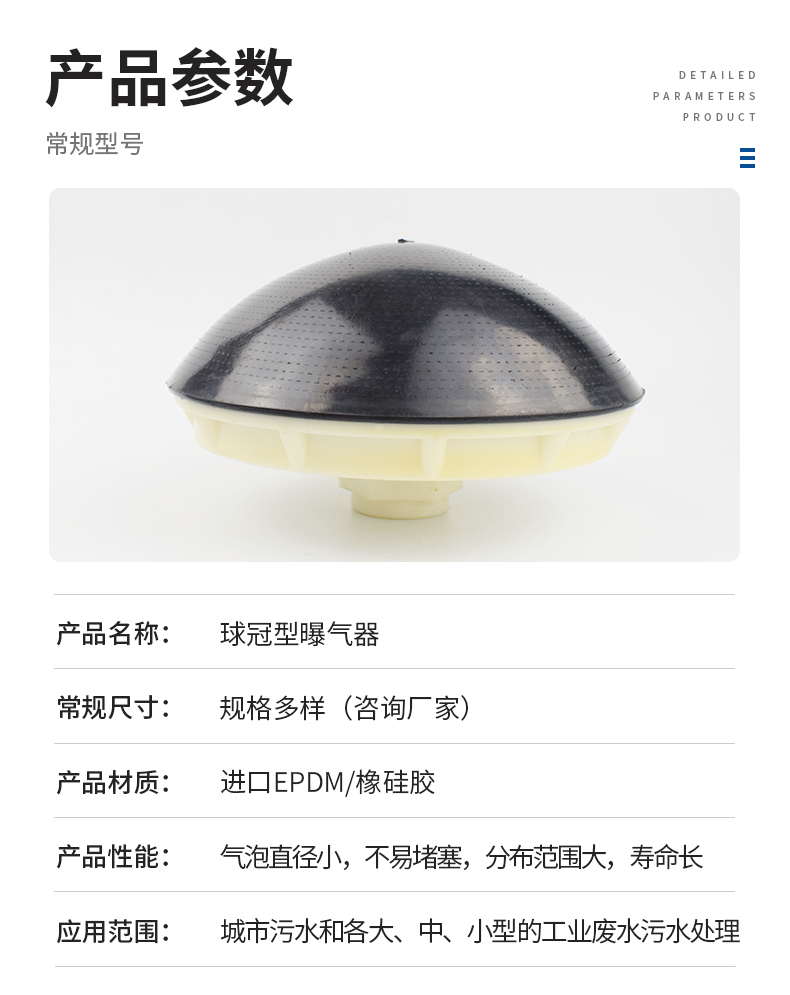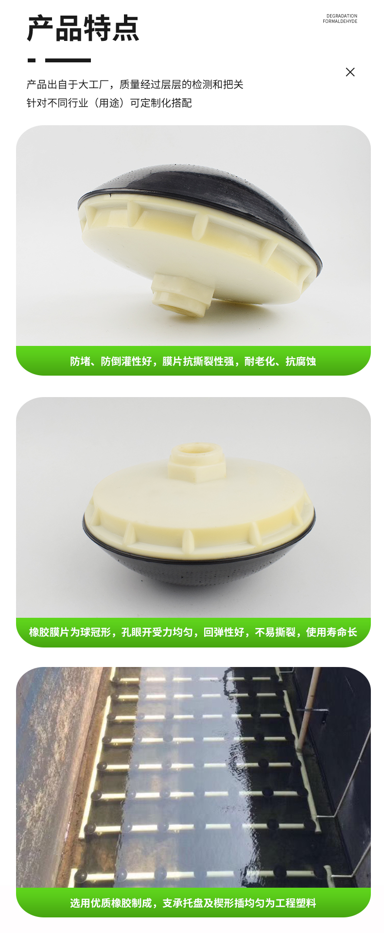 球冠bzo.w-192球冠形可張微孔曝氣器,是我廠根據(jù)污水生物處理的工藝特點(diǎn),在原膜片微孔曝氣器的基礎(chǔ)上,進(jìn)行專(zhuān)項(xiàng)研制開(kāi)發(fā)的新型曝氣裝置。曝氣器整體結(jié)構(gòu)科學(xué)合理、工藝先進(jìn)、設(shè)計(jì)新穎、微孔曝氣膜及支承托盤(pán)呈獨(dú)特的球冠形結(jié)構(gòu)。該曝氣器具有優(yōu)異的防堵及防水體倒流的性能。在間歇運(yùn)行工況條件下,曝氣膜表面不易沉淀污泥。較平板膜片式微孔曝氣器使用壽命更長(zhǎng),充氧效率更高,也適用于源水微污染生物處理。
