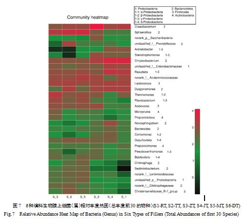 為進(jìn)一步揭示其群落結(jié)構(gòu)差異,基于細(xì)菌菌門水平(圖6)、變形菌門(表3)及菌屬水平(圖7)分析生物膜上的微生物群落結(jié)構(gòu)組成。由圖6可知,從菌門水平來看,不同填料反應(yīng)器中微生物群落組成的差異不是特別大。6種填料生物膜樣本的主要菌群均為變形菌門(Proteobacteria)、擬桿菌門(Bacteroidetes)、厚壁菌門(Firmicutes)及放線菌門(Actinobacteria)。以MT反應(yīng)器為例,其生物膜樣本變形菌門占比達(dá)56.2%,其次是擬桿菌門(25.3%)、厚壁菌門(14.8%)。其他5種填料生物膜樣本上的變形菌門占比介于28%~54.3%,擬桿菌門占比介于23.5%~57.3%,厚壁菌門介于9.2%~16.1%。該結(jié)果與前人研究結(jié)果相近,如Ma等[21]在序批式反應(yīng)器中發(fā)現(xiàn)的細(xì)菌群落組成中變形菌門(占比最大)、擬桿菌門及放線菌門占優(yōu)勢;Snaidr等[22]在常規(guī)活性污泥中對菌群多樣性的研究中發(fā)現(xiàn)變形菌門(Proteobacteria)為優(yōu)勢類群。在6個樣品中還有綠彎菌門(Chloroflexi)、浮酶菌門(Planctomycetes)、綠菌門(Chlorobi)及單胞菌門(Gemmatimonadetes)等,但所占比例均不同。其中綠菌門在顆粒化過程中有重要作用,能夠增強污泥的沉降性能。